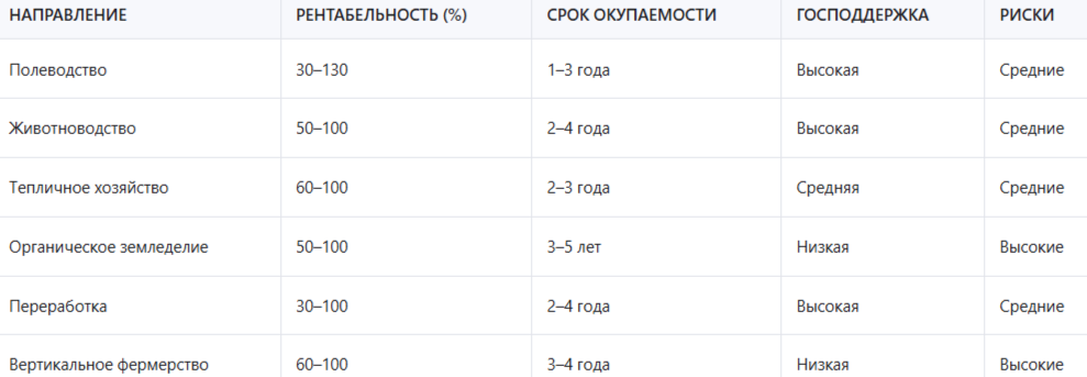 Из таблицы видно, что наиболее рентабельны тепличное хозяйство, вертикальное фермерство и переработка. Однако они требуют больших стартовых вложений и более сложной инфраструктуры. Если вы ищете стабильный доход с минимальными рисками — полеводство и животноводство могут быть лучшим выбором.